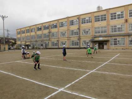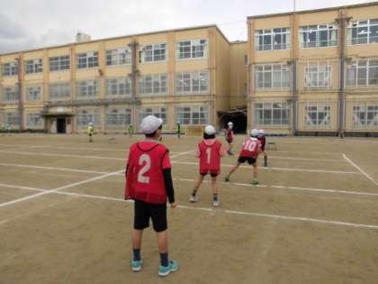 体育科の『エンドボール』の様子です。たいこうせん前に,チームの時間を取ると,チーム内でてきと味方に分かれ,ゲームを想ていして,動きをかくにんするチームを見つけました。円になり,キャッチボールをするのもいいですが,本番通りに動きながらパスをもらう練習もできて,良いですね。回数を重ねるごとに,ガードをしている友だちに「もっと右!右!」とべつの位置にいる子が声をかけている様子が見られました。またチームで〇〇大作せん!と作せんを立て,それが成こうしたときには,チームみんなで喜び合っていました。チームできょう力し合いながら進められています。