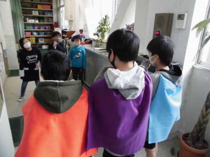 可愛いマントを着ているのは挨拶会社の子どもたちです。挨拶レンジャーとなり,校内を気持ちの良い挨拶で回っています。