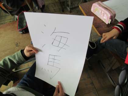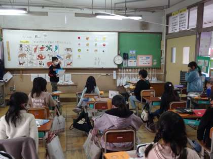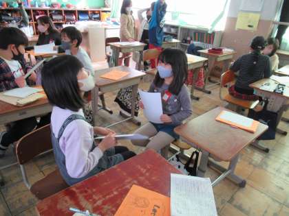 外国語活動では『What's this?』の学習をしました。1組はグループでクイズを考え,2・3組は1人ひとりでクイズを考えました。「It'a small.」 「It's a circle.」などとヒントを出し,何かを当てたり,漢字を使ったクイズを出したりしました。