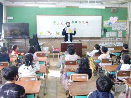 今日はアンドリュー先生に来ていただき,野菜や果物の発音を教えてもらいました。子どもたちは発音を真似して,意欲をもって取り組むことができました。英語の歌もどんどん覚えてきていますので,またお家でも聞いていただけたらと思います。