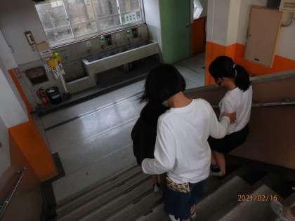 学校の中を歩きました。いつも生活している学校ですが,階段を降りることがとても怖く,不安な気持ちでいっぱいでした。サポートする側も,「どう声をかけると安心できるかな。」と考え,いろいろと試してみました。目が見えないことの怖さを知り,気持ちを考えることができました。