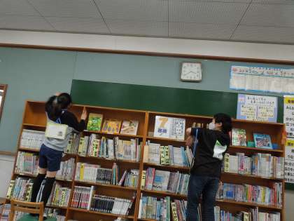5年生は,総合的な学習の時間で3学期はずっと「仕事」をしてきました。グループで会社を作り,校内でどんな仕事をするか相談して進めていきました。ほんのもりにも,複数の会社が入って,ほんのもりを盛り立ててくれました。A社は最後の仕事として大掃除をしました。普段できない書架の上のふき掃除,ホワイトボード磨き,本運び等々,いっぱいしました。ほんのもりが,普段とは違う輝きを見せてくれています。ありがとうございました。