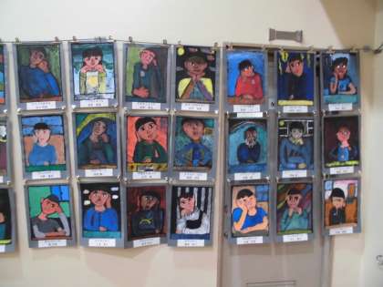 5年生は多色刷りの木版画にチャレンジしました。題材は「頬杖をつく友達」です。友達の頬杖をついている様子をしっかりとスケッチし,丁寧に彫刻刀で彫り進めていきました。色付けもこだわり,そのまま絵の具を使うのではなく,混色して自分が塗りたい色を作って刷ることができました。