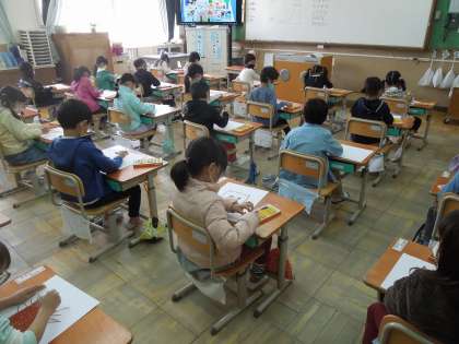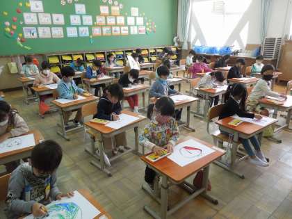 今日の図画工作の時間では,好きなものを画用紙にクレパスで描きました。