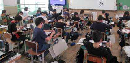 練習の中で見つけた自分のめあてに向かって半紙に筆を下ろす子どもたちの姿は真剣そのものです。