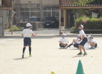 体育の学習で「遠投」をしています。長い距離を投げたり,的に向かって投げたりしています。なかなか上手に投げられず,苦戦していました。助走をつけたり,体の向きに気をつけたりしながら上達してほしいと思います。