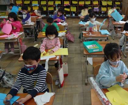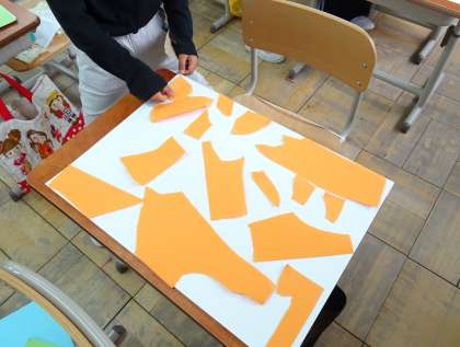 図画工作科の時間に「やぶいたかたちからうまれたよ」という学習に取り組んでいます。今日は,画用紙や包装紙をいろいろな形に破り,偶然できた形が何に見えるか想像しながら画用紙に貼りました。子どもたちは,「こんな形できたよ。」「横を向いている顔みたい。」など,想像を広げながら活動を楽しんでいました。
