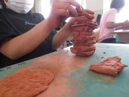 粘土を板状にしたりひも状にしたりしながら,粘土を立ち上げていきます。