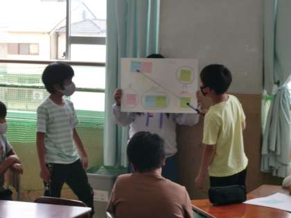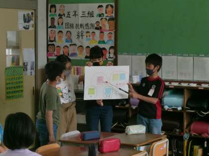 総合的な学習の時間(いろどりタイム)に梅津のステキについて交流会をしました。自分たちが考える梅津のステキと,お家の方が考える梅津のステキの同じところや違うところを確認し,まとめました。次の時間は,梅津のステキなところを実際に見に行きます。