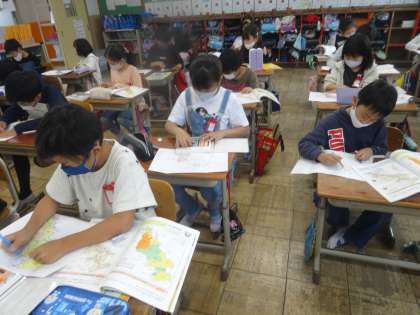 社会科の学習で京都府について学習しています。京都府の人口や土地の使われ方など学習してわかったことをリーフレットにしてまとめました。