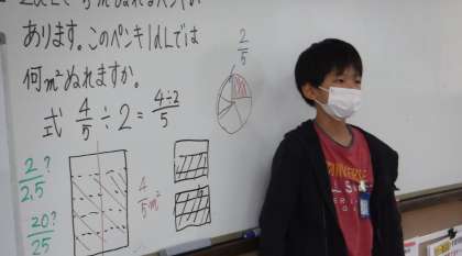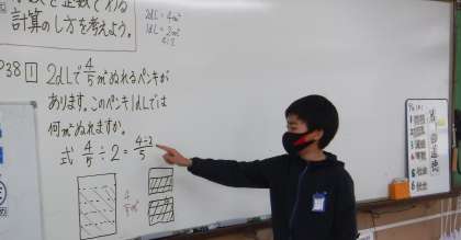 算数では分数÷整数の学習に入っています。これまでに学習してきたことを生かして分数を整数で割るにはどうすればよいのかみんなで考えています。自分の考えたことを説明するときには,前に出てきて図を使ったり,指をさしたりしながら話すことを意識しています。分かりやすい考え方が出てきたときには思わず「あー」という声があちらこちらでもれていました。これからもみんなで考えを作り上げていく学習を進めていきたいと思います。