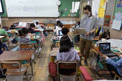 音楽の学習では,鍵盤ハーモニカで指またぎと指くぐりの練習をしています。初めは指使いが複雑で「なかなかうまくいかない。」と何度も練習をしました。音を出しながら指を上手く変えることに苦戦している様子でしたが,だんだんできるようになってきました。今回は個人タブレットを使って,演奏している様子を動画で撮影し,自分で見てみることで改善点を見つけることができました。