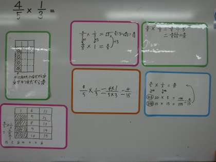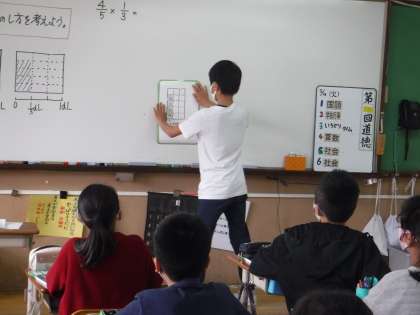 算数では,分数×分数の計算に入っています。これまでに学習してきたことを生かして計算方法を考えました。自分の考えたことを分かりやすく説明するために図などを使っています。分数×分数のマスターになれるようにこれからの学習で一つずつ頑張っていきます。