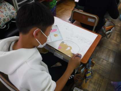 図画工作で人権ポスターに取り組んでいます。今日は考えた下書きを画用紙にかきます。どんなレイアウトにしたらいいのか,どんな言葉を入れたら自分の伝えたいことが伝わるのか考えながら取り組んでいました。下書きができた子から色塗りに入っています。力作ぞろいのポスター,完成が楽しみです。