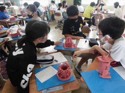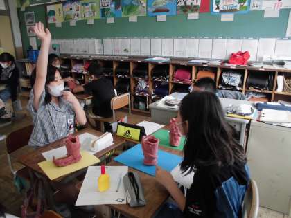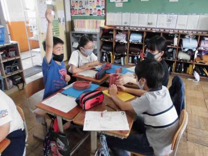 図画工作で作った「使って楽しい入れ物」の鑑賞会を行いました。