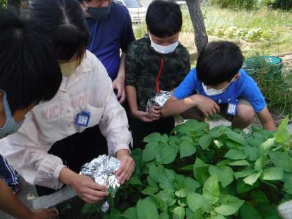 今日から「植物の成長を日光のかかわり」という学習が始まりました。植物の成長には日光が必要なことは5年生の時に学習していますが,なぜ必要なのかどのようなはたらきをしているのかを調べていきます。今日は明日の実験に向けて,じゃがいもの葉にアルミホイルをかぶせて準備をしました。どんな結果になるのか明日の実験が楽しみです。