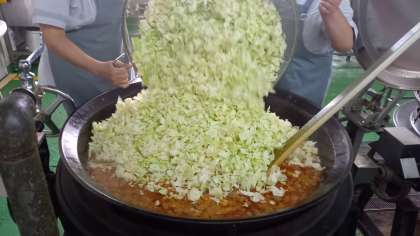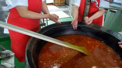 給食室では,豚と牛のひき肉と塩・こしょう・料理酒を練り,野菜を煮たスープの中に調理員さん総出でまるめて入れていきました。