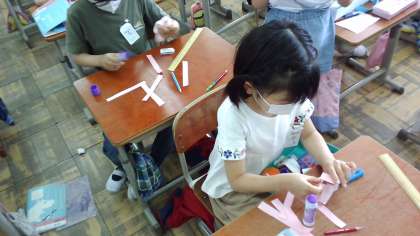 算数の学習でものさしを使って「長さ」の学習をしています。数字の書いていないものさしに最初は苦戦していましたが,少しずつわかるようになってきました。折り紙を2cmの長さで切って輪飾りを作ったり,10cmの長さの紙テープを切って,教室の中の10cmの長さのものを調べたりしました。