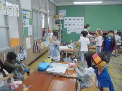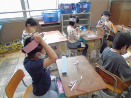 図画工作の時間に色画用紙を使ってわっかを作り,輪ゴムを使うことで頭やおなかにつけられるようにしました。ホッチキスを使ったのですが,初めて使う人もいて,
