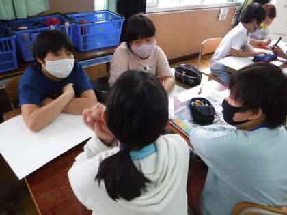 社会科で震災復興の願いを実現する政治の学習の最終段階として,「気仙沼市を元気にするための町の活性化プロジェクト」を考えています。人口減少に課題を抱える気仙沼市を元気にするために子どもたちなりの知恵を絞ってどうすればよいのかを考えています。特産品のカツオやサメを使ったオリジナル商品を考えたり,キャラクターを考えたり,それぞれのグループで趣向を凝らして取り組んでいます。まだまだいいアイデアが出てきそうです。今週金曜日のプレゼン大会が楽しみです。