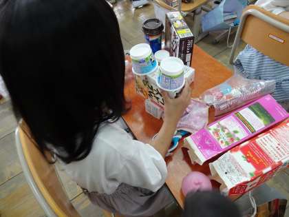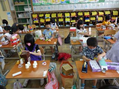 「筒はタイヤにしよう」「細長い箱を使って船を作ろう」など,とても楽しんで作っていました。