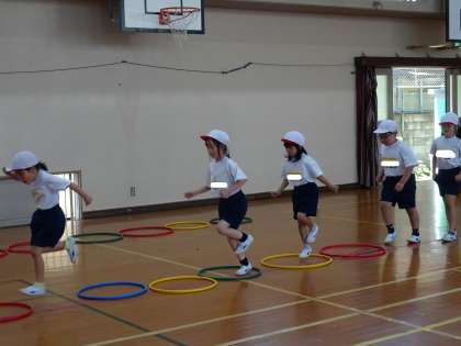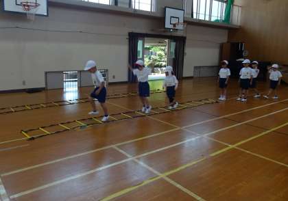 今日の体育は「まねっこあそび」をしました。フープやラダーなどで作ったコースを先頭の人と同じ動きをしながら進みます。先頭のリーダーは,コーンをジグザグに進んだり,ラダーの跳び方を工夫したりしていました。ゴールをしたら,リーダーと同じポーズで並びます。片足を上げたり,変身ポーズをしたりと個性的で可愛かったです。みんなとても楽しかったようで,「もう一回やりたい!」と話していました。次はまた道具を変えてやってみようと思います。