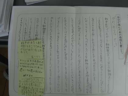 国語科の「一つの花」の学習の並行的な読書で「戦争に関する本」を読みました。その中から自分のお気に入りの本について感想を書き,交流会をしました。交流会では,友達から付箋を使ってコメントを書いてもらいました。自分の感想を読んだもらい,コメントももらえてうれしそうにしていました。