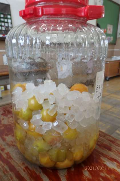 いろどりタイムでつけたウメジュースから,たくさんの梅酢ができてきました。毎日クラスの子どもたちがビンを回し,大切にしています。「早く完成してほしいな。」「おいしそうなウメジュースができてきている。」と,とてもうれしそうです。