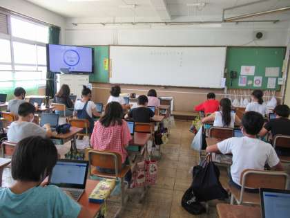 帯時間にタブレットを使うと聞いてわくわくした様子を見せていた子どもたち。タイマーがカウントを始めると,真剣な面持ちでタブレットに50音を打ち込み始めました。
