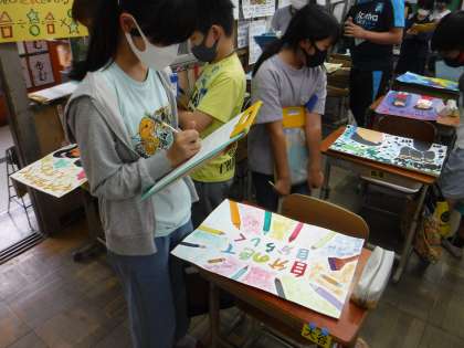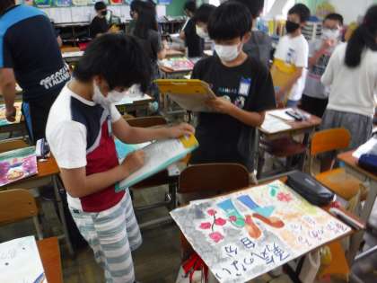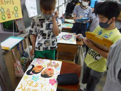 図画工作で取り組んだ人権ポスターの交流会を行いました。それぞれが人権について考え,伝えたいことを絵や文字で表現しました。それぞれの思いがぎゅっとつまったすてきなポスターが仕上がりました。交流しながらも,友達の良さを見つけ,「この色使いいいな」「この部分の塗り方がうまいな」とつぶやいていました。
