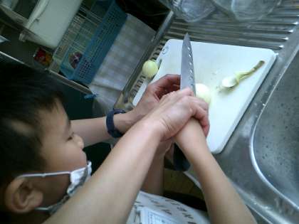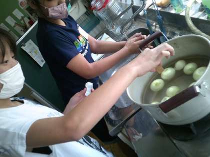 皮をむいて,上下を切り落とし,十字に切り込みを入れて煮込むだけ。小さな玉ねぎの皮を一生懸命むいていました。玉ねぎが小さかったので,切るのも大変そうでしたが,調理はあっという間でした。
