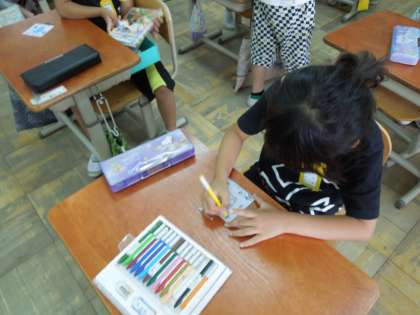 最後に6年生が用意してくれた名札を書いたり,色塗りをしました。