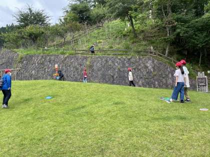 1人1枚ずつフリスビーをもってゴールポストを狙います