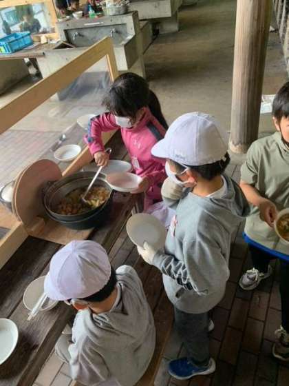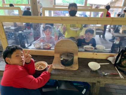 自分たちで作ったすき焼き風煮を食べました。ご飯がうまく炊けて、子供たちはとても喜んでいました。