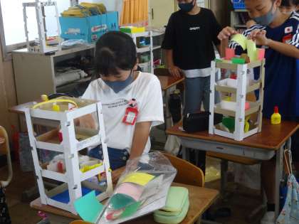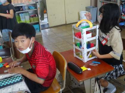 図画工作科の学習で「ビー玉」の転がるコースを作っています。それぞれテーマを決めて,オリジナルのコースを作っています。工夫いっぱいのコースがたくさんできました。