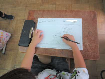 図画工作の時間に,お話を聞いて,好きな場面について想像して描く学習をしています。
