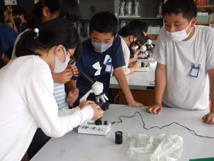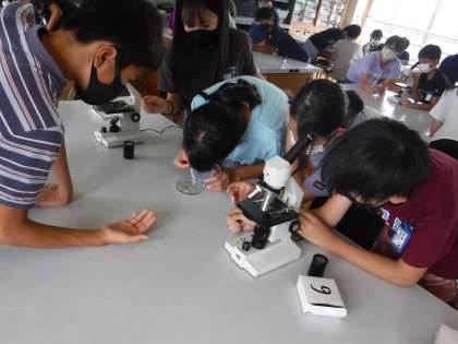 理科では生物同士のかかわりについて学習しています。今回は学校のビオトープの池にはどんなプランクトンがあるのかを顕微鏡で観察しました。最初は顕微鏡の使い方にとまどう様子も見られましたが,徐々に慣れ,水生生物を見つけることができていました。ミジンコの心臓をみることができたり,くるくる回る生き物を観察できたりしました。次はタブレットを使って調べていきます。