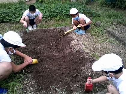 前に草を抜いた畑に肥料を入れ,みんなで土を混ぜ合わせ畝を作りました。
