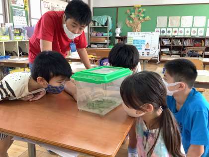 理科・生活の時間に昆虫(バッタ)の観察をしていました。さわれないだけでなく,虫かごに入っているバッタでさえ怖がって逃げている子もいますが,足の数を数えるために,気付いたら至近距離で観察していました。目の位置を探していると口があることやはらの模様にまで気づいていました。学ぶ意欲はすごいなと思いました。