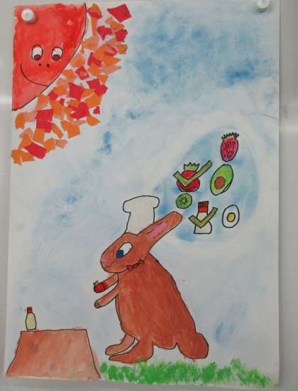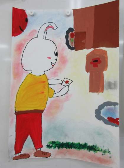 1組は「野うさぎレストランへようこそ」という本のお話の絵を描き上げました。