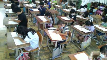 書写の時間。子どもたちは,画の長さや画と画の間に気を付けながら,集中して文字を書いていました。