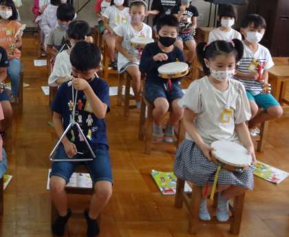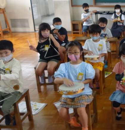 今日,初めて音楽室で学習をしました。1学期に学校探検で何度か見たことはありましたが,中に入って学習するのは初めてだったのでみんなとても嬉しそうでした。今回は,タンブリン,鈴,トライアングルを使ってリズム打ちをしたり,いろいろな音の出し方を試したりしました。最後には,気持ちを合わせて上手に演奏することができました。