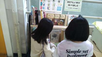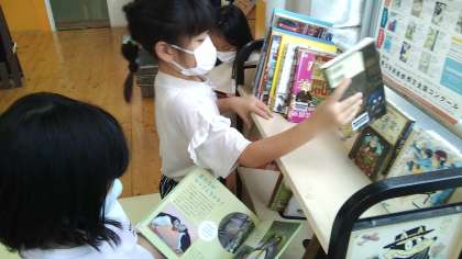 「あ!銭天堂の本がある。」「この動物の本も面白そう。借りよう!」と,本棚の前で会話を弾ませていました。