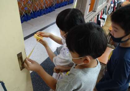 今日は,先生の机を教室の入り口から出せるかどうかを,物を動かさずに調べる方法を考えました。「手で測る。」「体全体を使う。」など,いろいろな意見が出ました。その中で,テープを使って長さを測って比べる方法をみんなでやってみました。この方法を使うと,簡単にいろいろなものの長さを比べることができると分かりました。来週もいろいろな大きさ比べをしたいと思います。