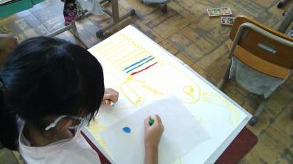 「こんな模様があると思う。」「この色とこの色を混ぜたらきれい。」と,想像をふくらませながら,活動を楽しんでいました。