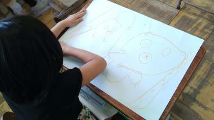 「くまのこるうくんとおばけのこ」のお話を聞いて想像した場面を色画用紙に下書きをしていきました。