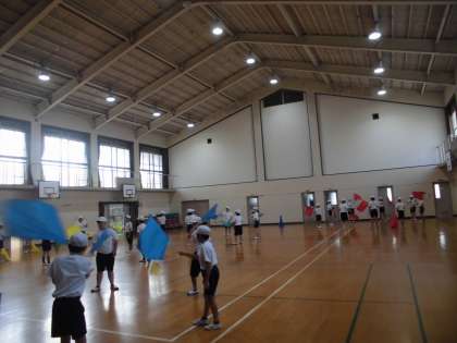 先日,棒を持ってダンスの練習をしていました。それが,なんと旗付き棒に変わっていました。風になびかせて旗を振るのも,1つコツがいりそうですよ。