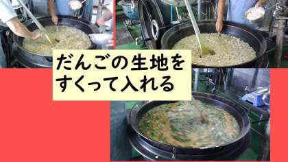 「トマトだご汁」は,けずりぶしでだしをとり,タライに小麦粉・片くり粉に塩とホールトマトの果肉と果汁をつぶしたものを入れて練り,ひとまとめにしてねかせだんごの生地を作り,だし汁で鶏肉・玉ねぎを煮た中に,だんごの生地をスプーンですくいながら入れていき,生のトマトや小松菜を入れて仕上げていきました。