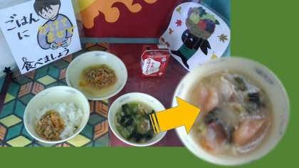 10月5日(火)の給食献立は,「ごはん・ツナそぼろ丼(具)・トマトだご汁」でした。