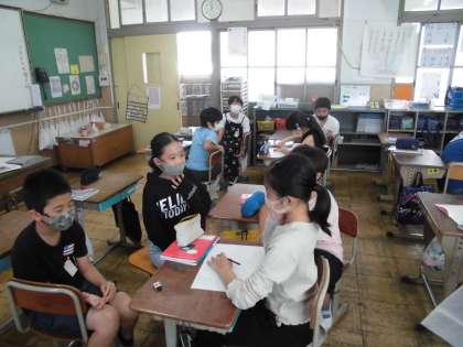 国語科では,話し合いで考えを深めるための学習をしています。自分の立場をはっきりさせたり,相手の意見のいいところを見つけたりして,自分の意見を伝えます。考えが揺さぶられ,心が動くときもありますが,それも経験です。授業で練習したことを,日常生活でも生かせたらいいですね。